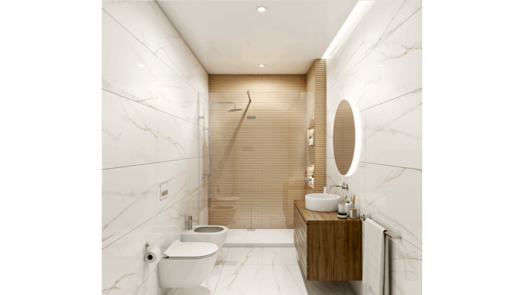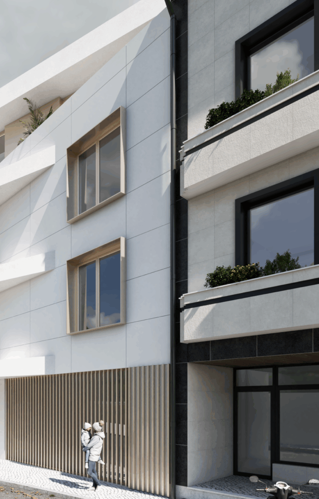 As zonas comuns e exteriores distinguem-se por soluções de revestimento em cerâmica, pedra natural e alumínio, num equilíbrio entre durabilidade, estética e integração arquitetónica.