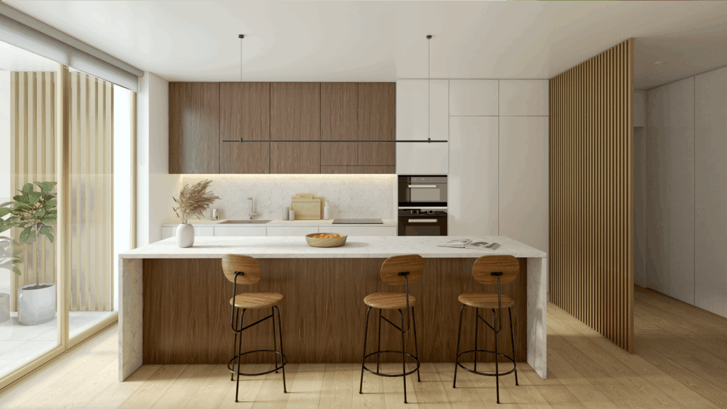 No interior, predominam materiais de qualidade e acabamentos elegantes, como pavimentos vinílicos, revestimentos cerâmicos e carpintarias lacadas. As cozinhas e instalações sanitárias estão totalmente equipadas com aparelhos Bosch e louças Sanindusa, garantindo design e funcionalidade.